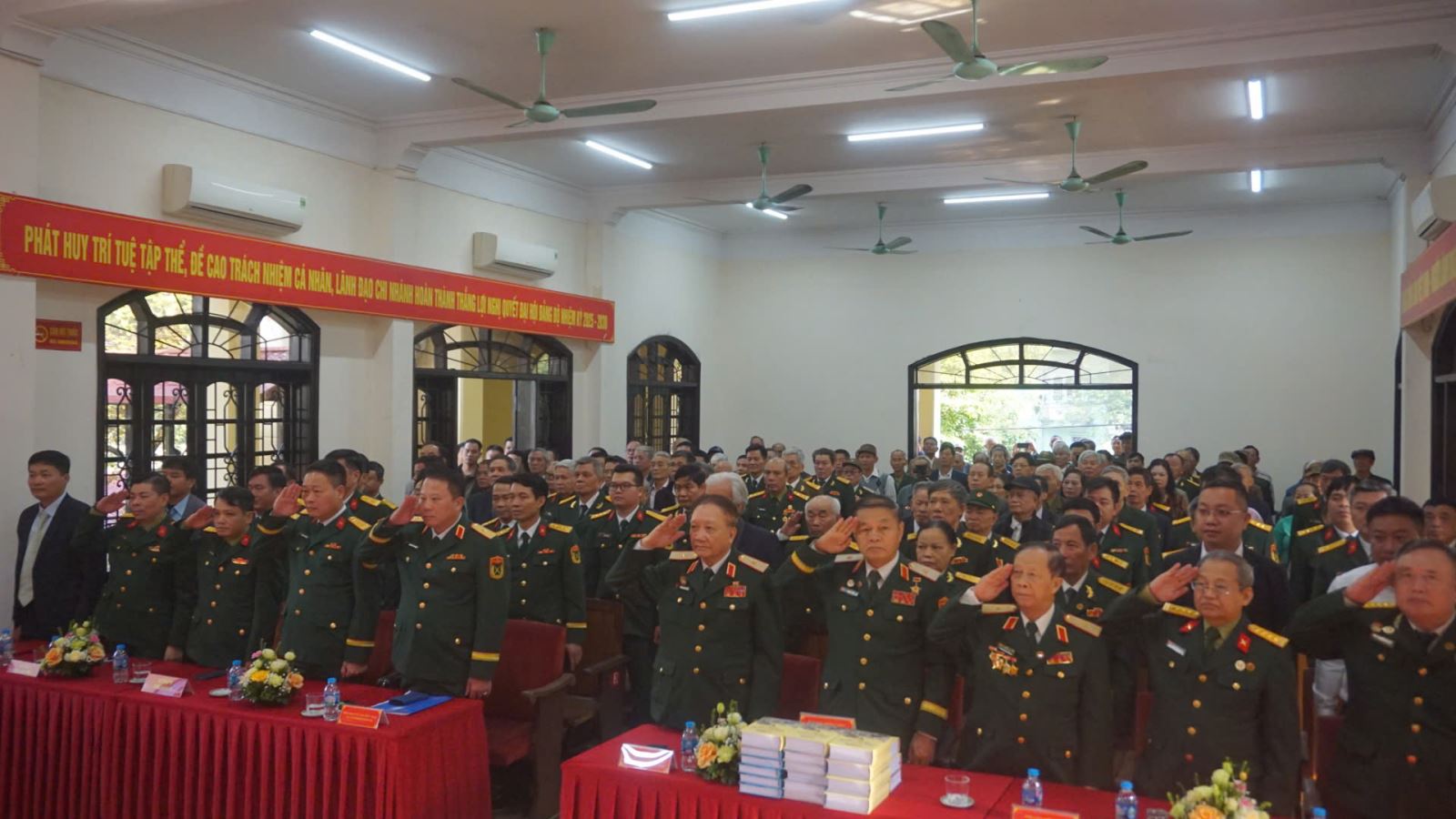 Các đại biểu thực hiện nghi lễ chào cờ trong không khí trang nghiêm tại buổi lễ kỷ niệm truyền thống